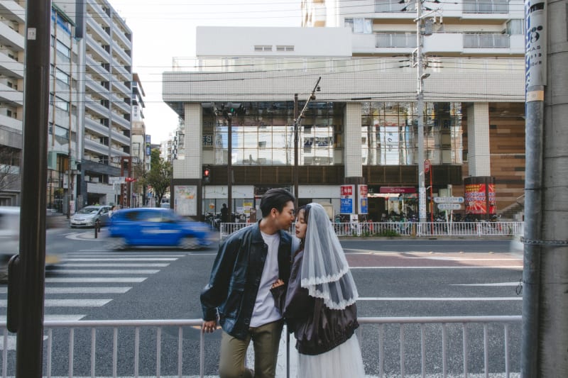 すれ違う車や通行人の中でも、お二人だけの時間だけが止まったかのようなシーンです。