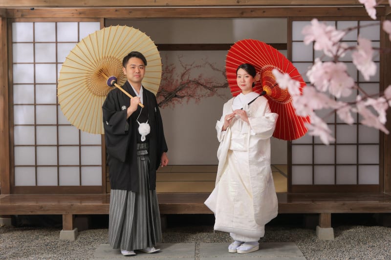 お二人で和傘を持ったお写真も撮影させていただきました!お二人の自然な笑顔とっても素敵です!