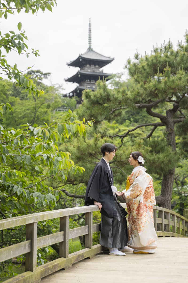 本日は和装洋装どちらもお召しになり、場所は三渓園とハウススタジオでのプランでした。