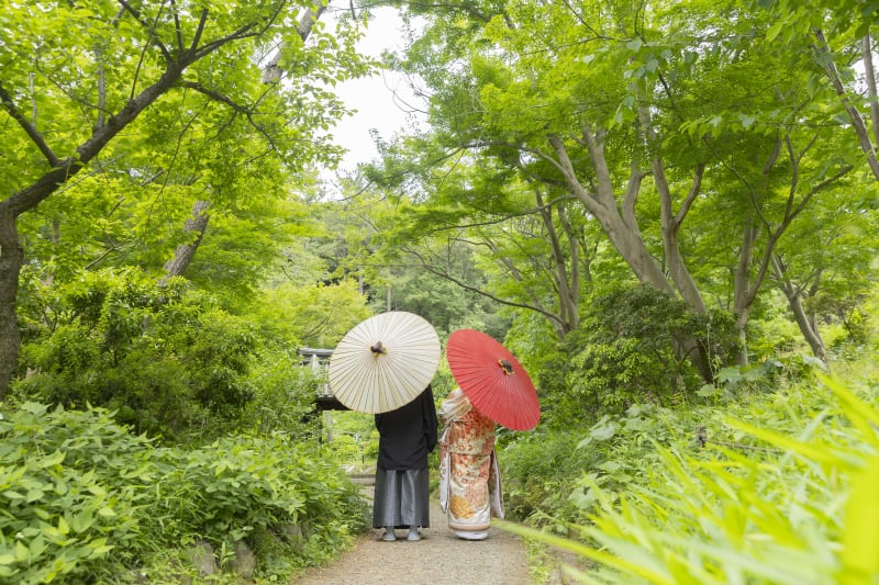 緑の中で和傘を使うととても綺麗に映えますね^^