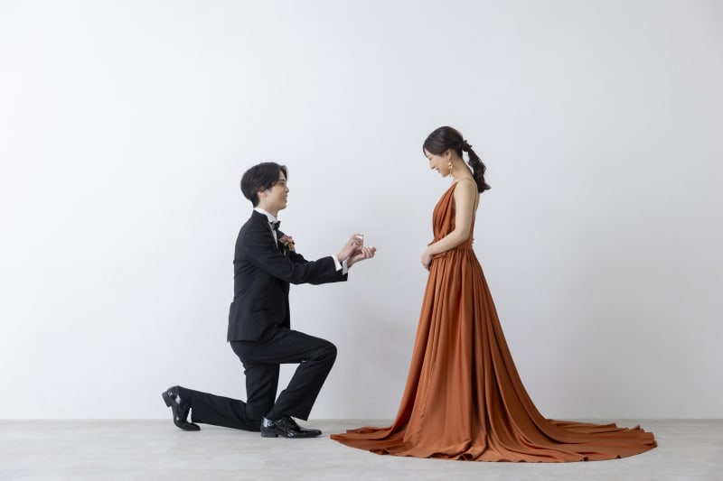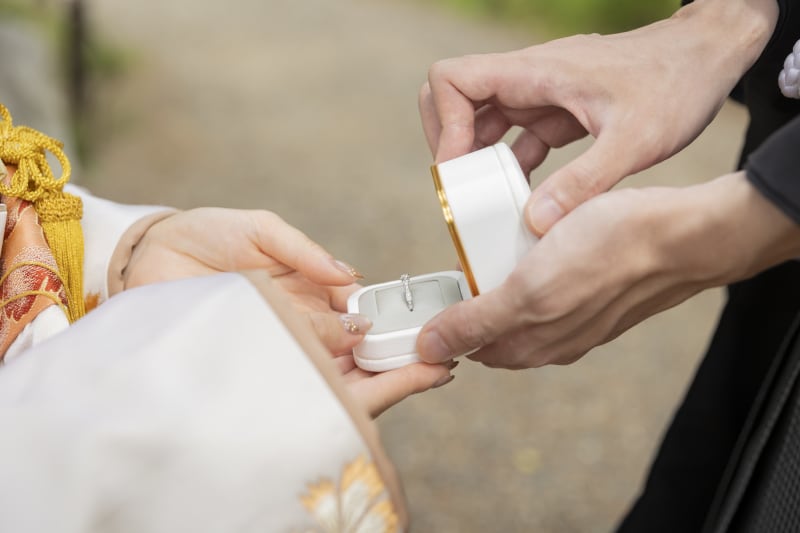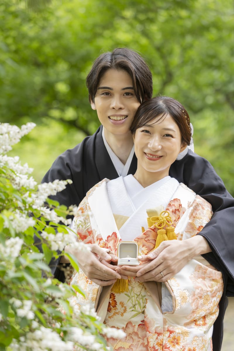 指輪のケースを持ち込んでプロポーズショット。指輪を持つお二人の表情が幸せそうです^^