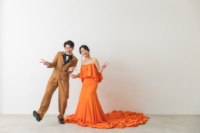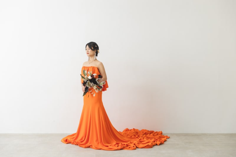 1着目はこちらのカラードレス!オレンジ色がとっても似合っています^^新婦様はご妊娠中の方でしたが、ご妊娠中の方たちにも入る衣装がたくさんあります!!