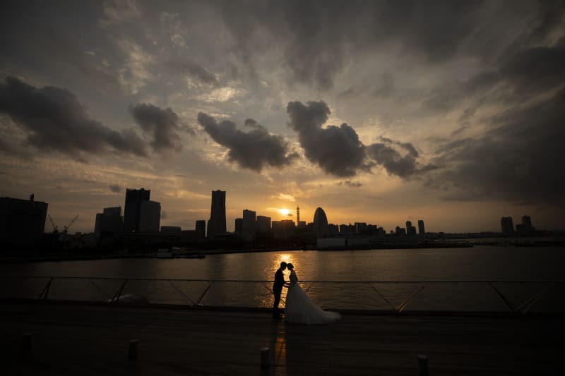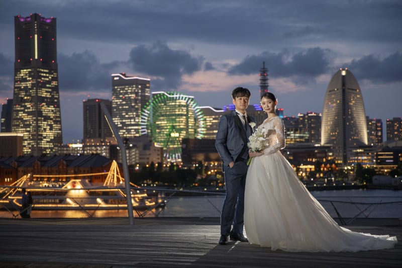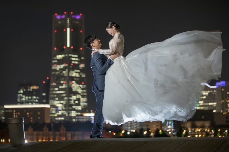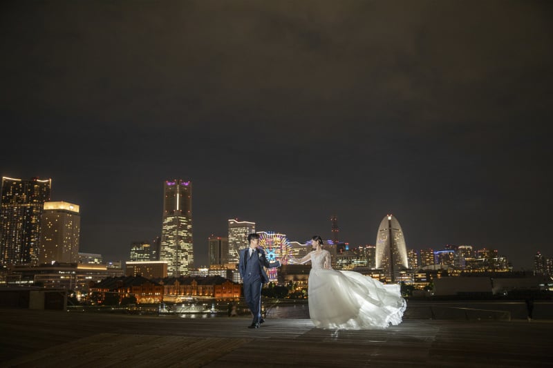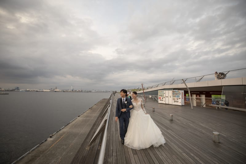 大桟橋といえばこの場所。みなとみらいの街を背景にドレスが美しくなびきます。