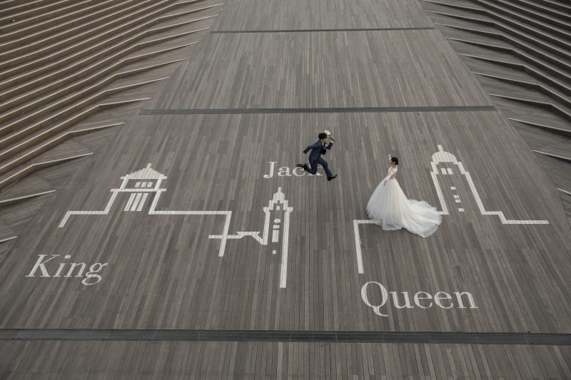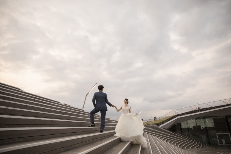 大さん橋の大階段で新郎様がエスコート。お二人ともポージングは完璧です。