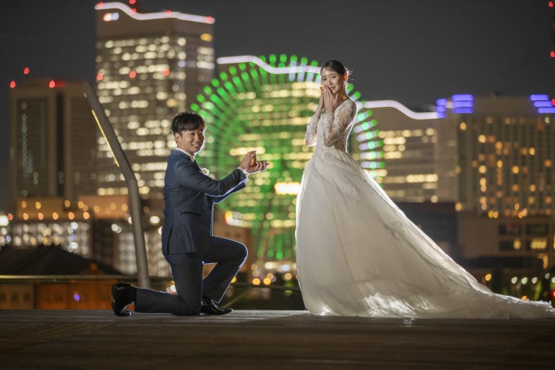 観覧車の前でプロポーズショット。お二人とも表情もバッチリでした。