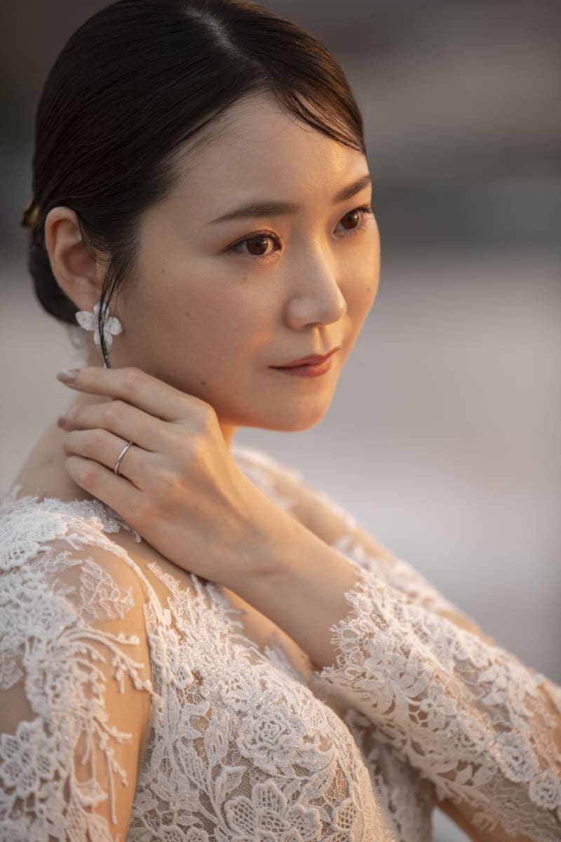 夕日を浴びた新婦様。目鼻立ちがくっきりと整っております。