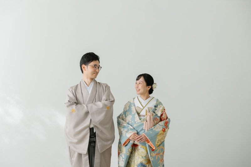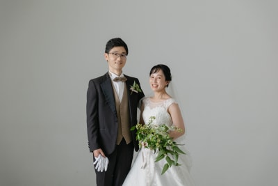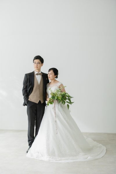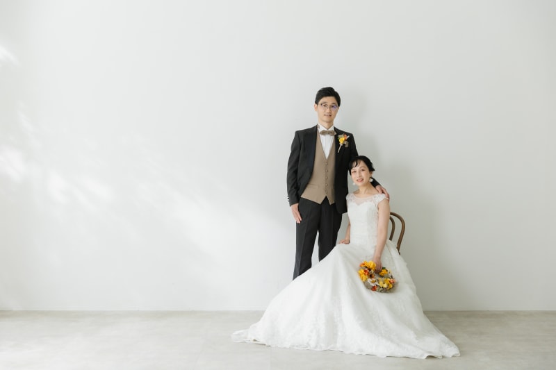 シンプルな背景だからこそお二人の表情や衣装が際立ちますね