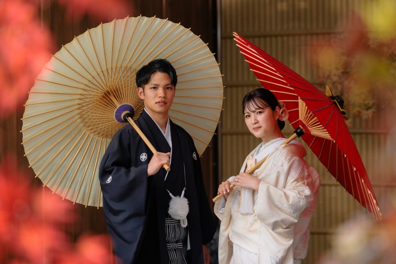 まずは和装から!小物や背景を変えて色鮮やかな雰囲気で撮ることが屋内庭園ではできます!
