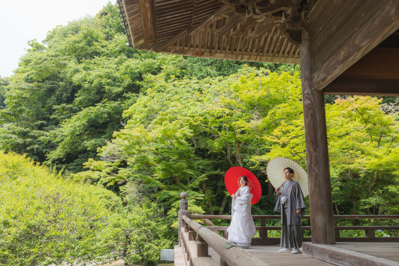 赤と白の和傘を使って、妙本寺ならではの自然と建物が引き立つ一枚になりました!