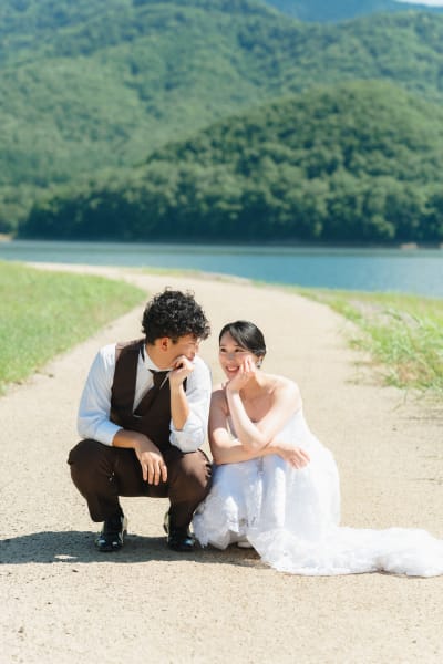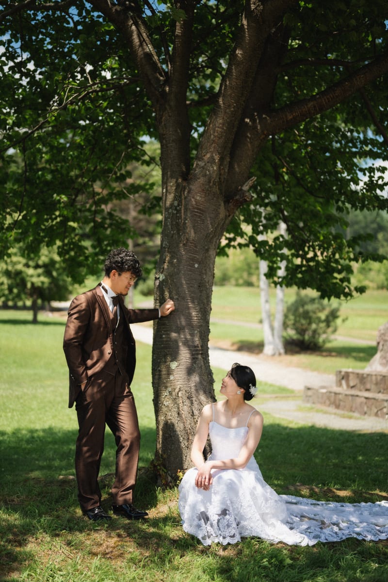 木陰に座る新婦様を見つめる新郎様。のんびりとした雰囲気も素敵ですね!