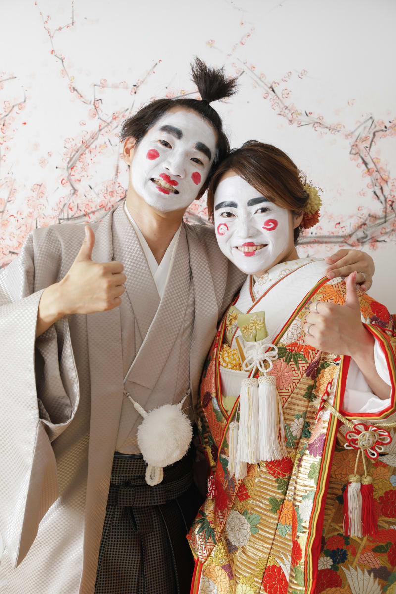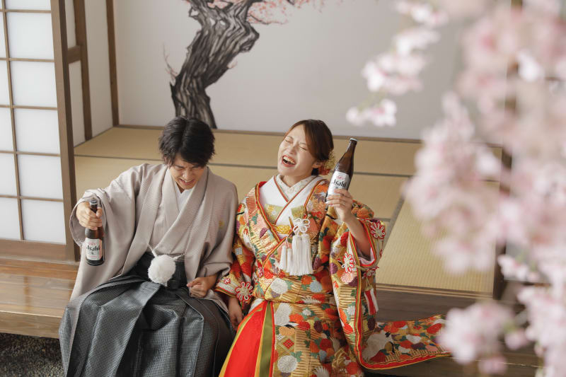 本日は屋内庭園スタジオのご紹介です。撮影して頂いたお二人は底抜けに明るくて、笑顔が絶えませんでした。竹刀、バレーボール、ビール瓶と愉快な撮影をして、最後は白塗りで締めました。照れなど一切なく全て全力投球でした!!