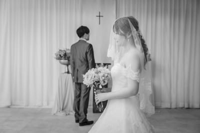 チャペルの背景では、かっちり立ち姿や、お式のようなベールアップ・指輪交換シーンなどを撮影させていただきました!
