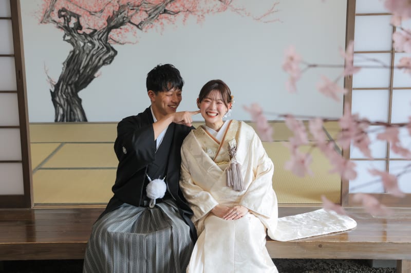 和装では縁側に座って撮影! 新郎さんが新婦様にほっぺをつん!可愛いですね