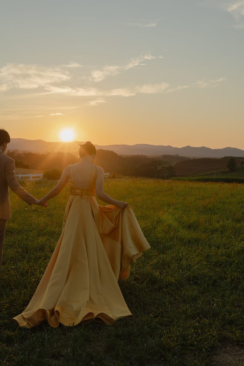 次は美瑛の新栄の丘に移動しました!ここで衣装もチェンジ!夕日に合ったオレンジ色のお衣装です♡