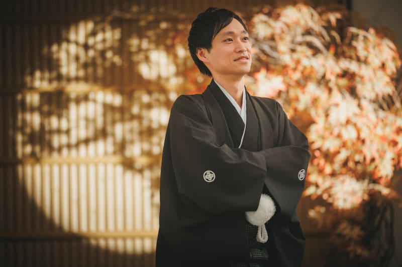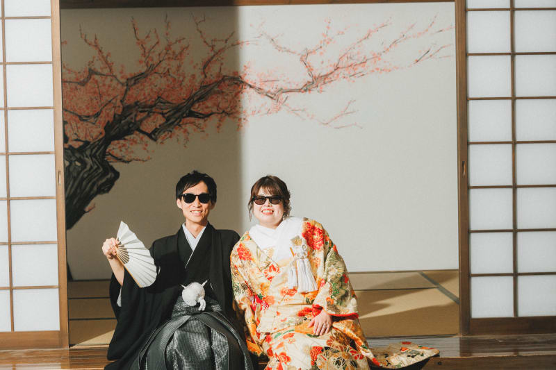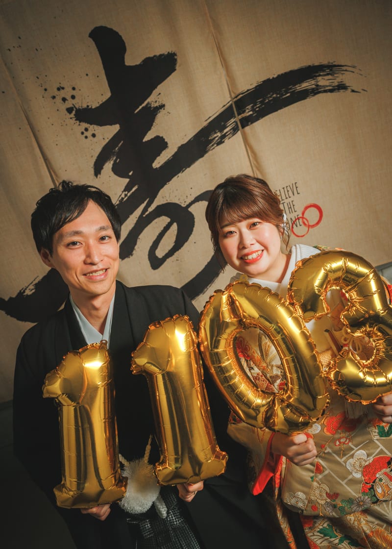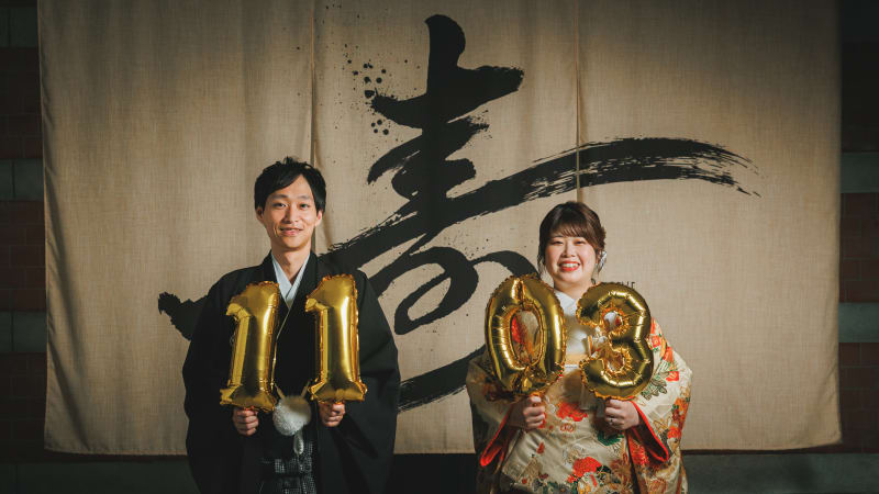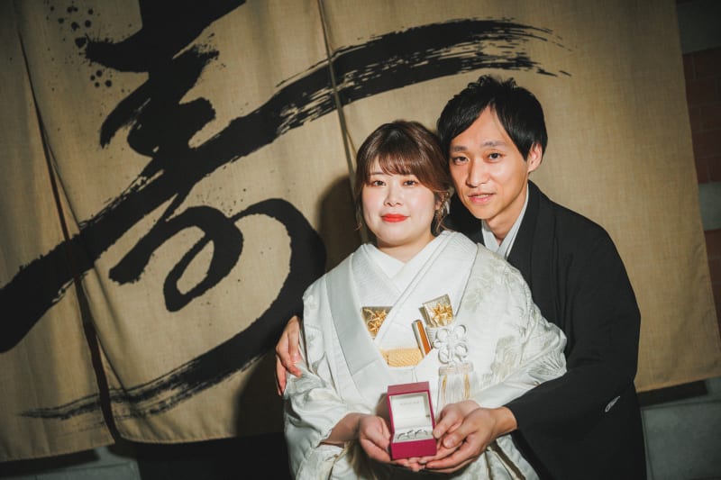 お次は「寿」と書かれた暖簾の前でお二人が持ってきてくださったアイテムを使って撮影!