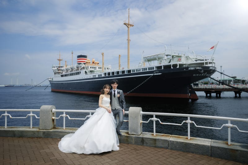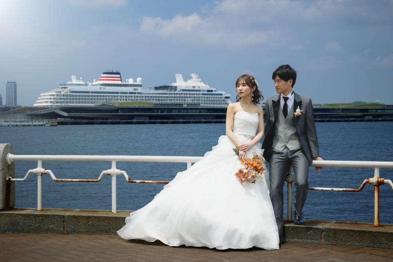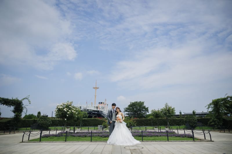 和装から洋装にお着替えし、山下公園にて撮影スタート! まずはフォーマルな撮影から♪