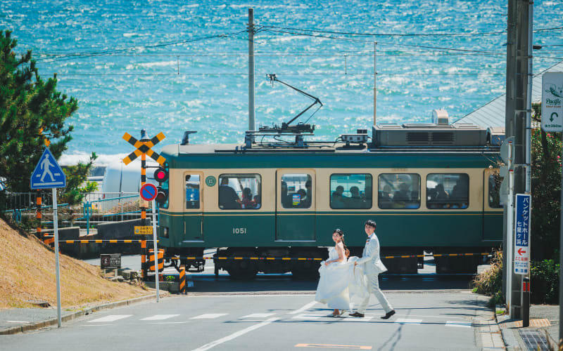 続いて江ノ島!有名な江ノ島電鉄とも一緒に撮っていきました!