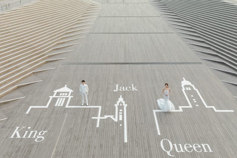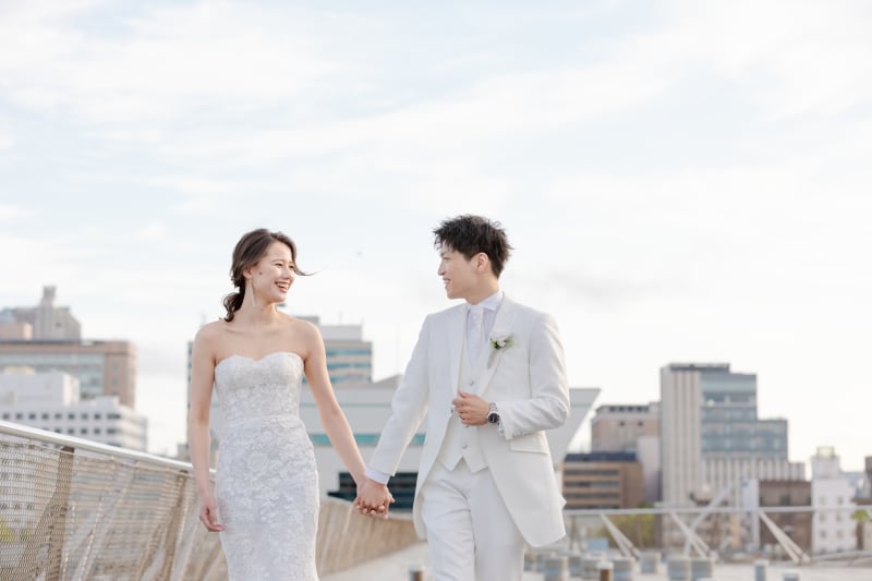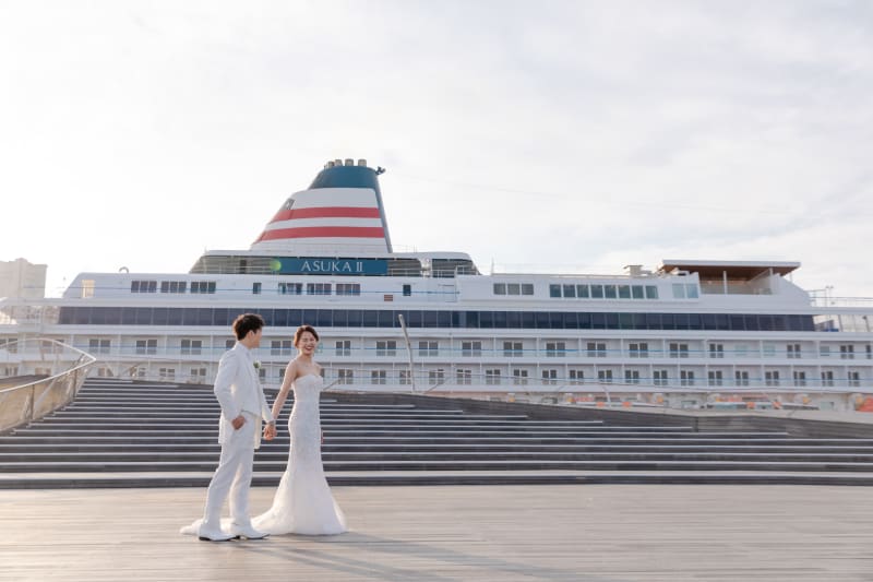 とても広い大桟橋の上では、お二人の白い衣装がとても際立ちます。