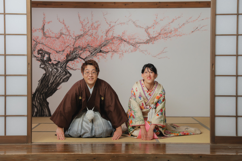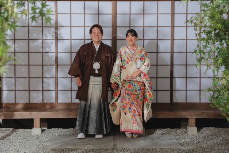 ピンク色のお花のアーチの背景では、和装のお堅いイメージから優しい雰囲気になりますね♡