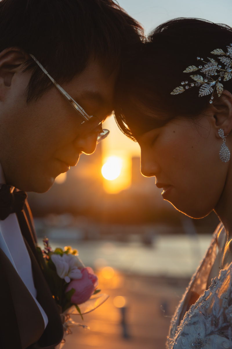お二人の間にオレンジ色の夕焼けの光が輝いています★とっても美しいですね〜!