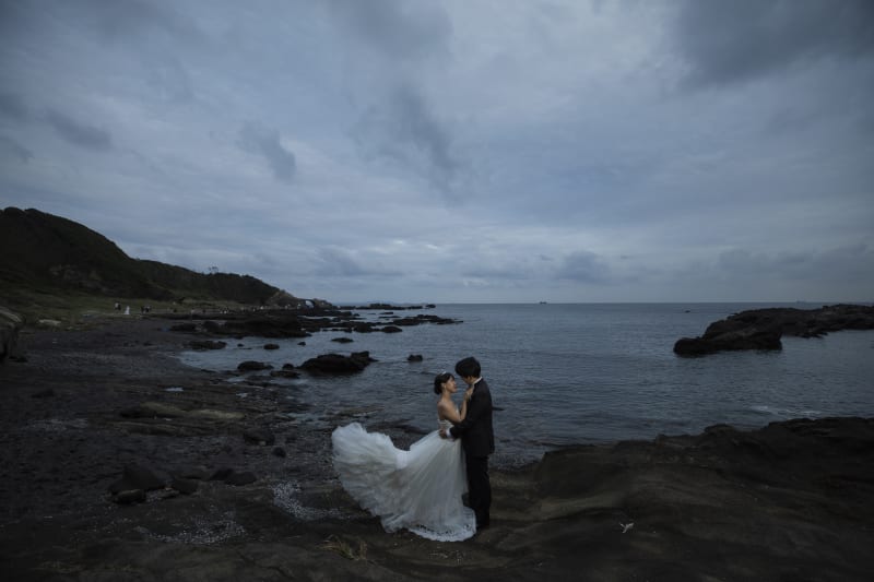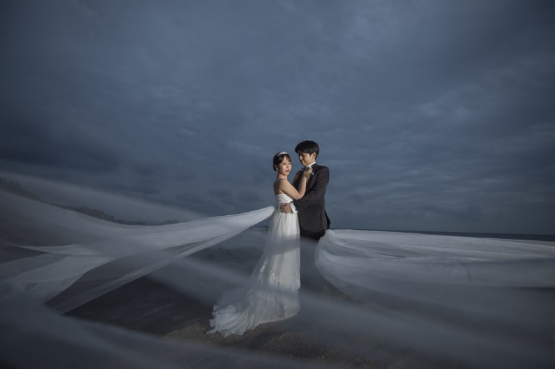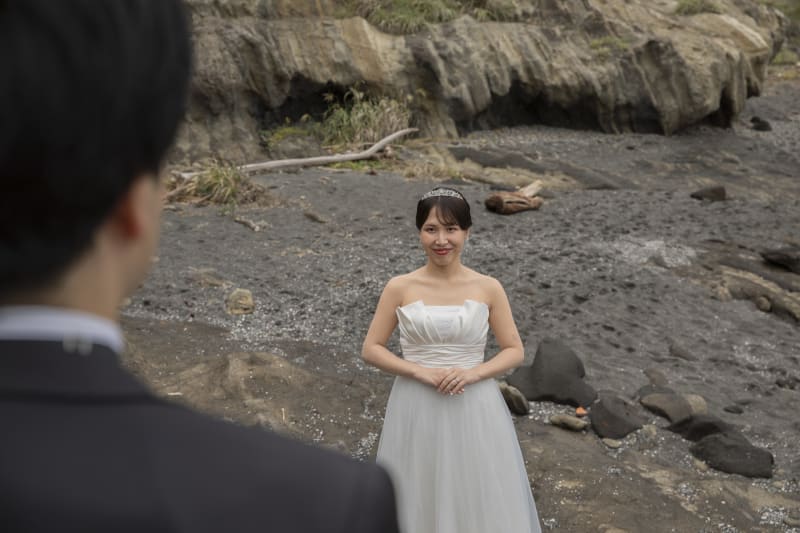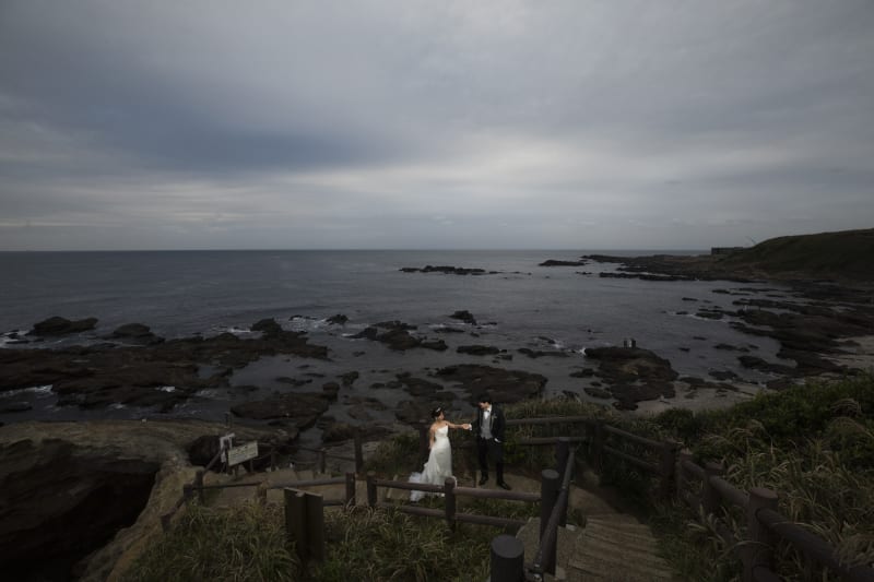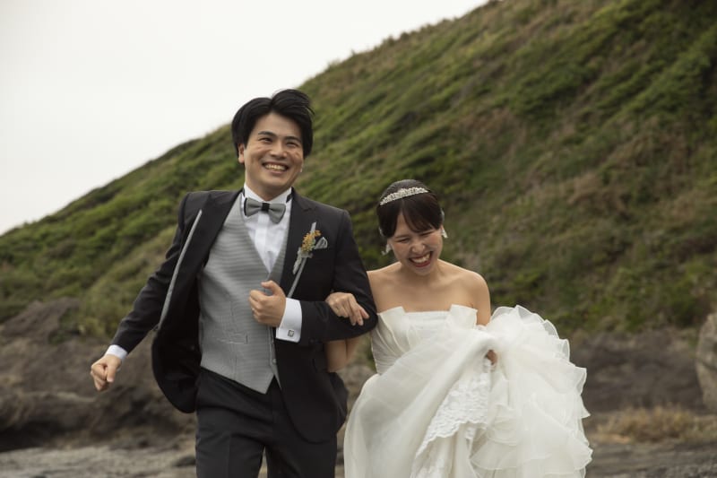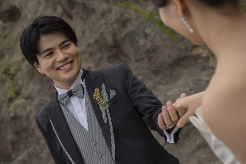穏やかな海を背景に二人で散歩。落ち着いたお二人の雰囲気にぴったりです。