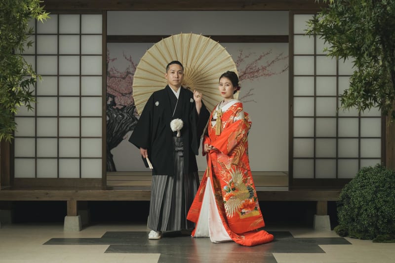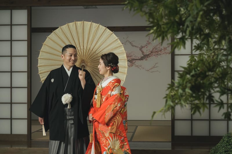 フォーマルな立ち姿のまま、新郎様に和傘を担いでいただくだけで、 シンプルながらもお二人が望まれていた演出ができました!
