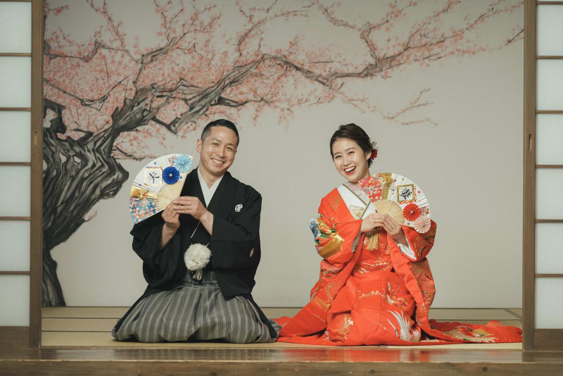 ご挨拶が終わりましたら、お待ちかねのアイテムアレンジ!!! お二人っぽさを演出できる扇子も大活躍♪ 持ち込んでいただいたアイテムで、お二人がやてみたかったカットの完成です!