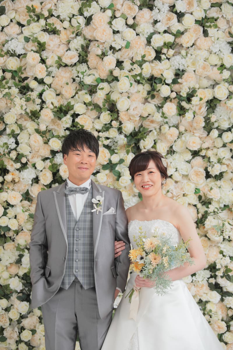 一面お花の壁の前に立つおふたり!ウェディングならではの特別感に溢れておりますね!