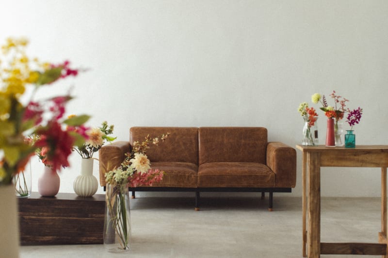 白壁の前にソファ、お花、そして本をいい感じにレイアウトしてみました。