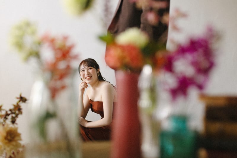 お花の間から満面の笑みの新婦様、新婦様の視線の先には。