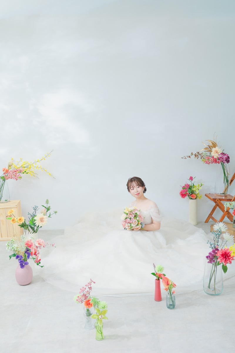 お花に囲まれて幻想的に。お花が好きなお嫁さん、とても喜んでおられました♡せっかくなら普段取らないこんなカットもぜひ♡