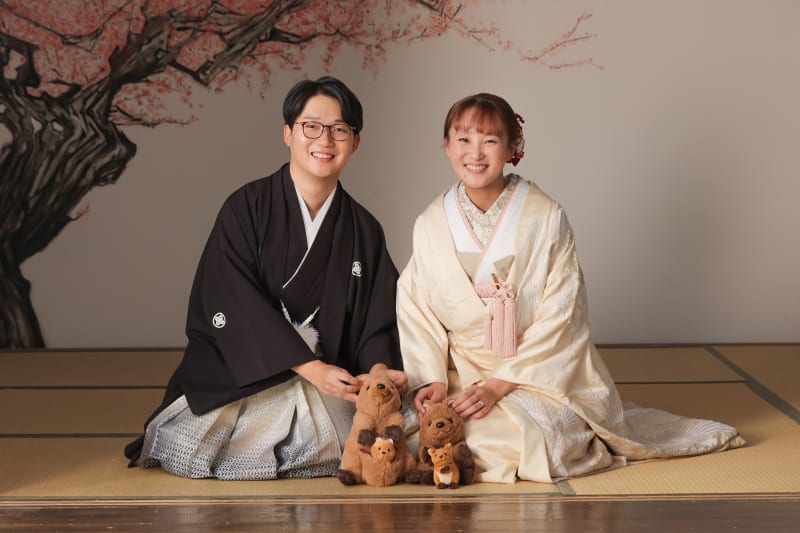 正座のショットでぬいぐるみと撮影!家族写真のようで可愛いですね
