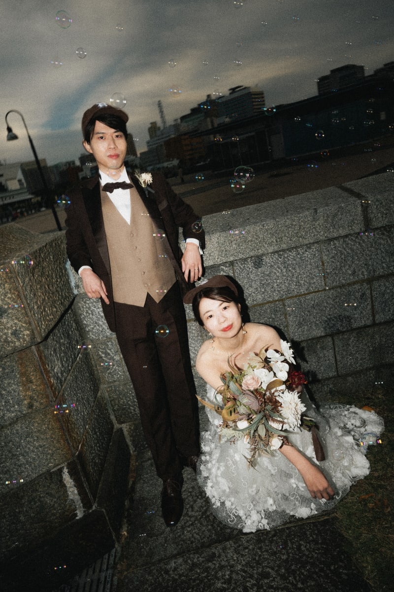 最後は日が落ちてきた頃に、シャボン玉を吹いて少しレトロのような雰囲気にのお写真を。