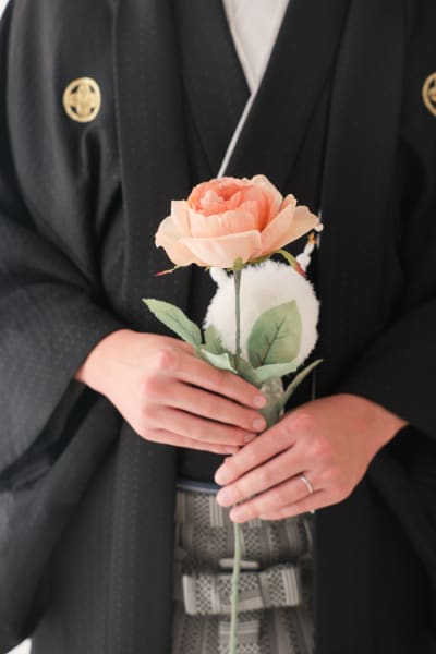 おふたり一緒のお花を持って。着物とも色味が合っていて素敵ですね〜