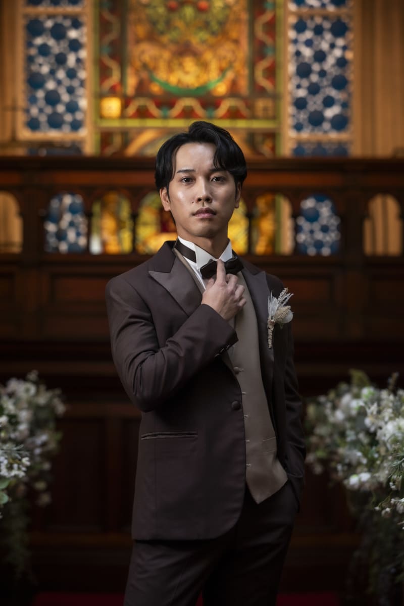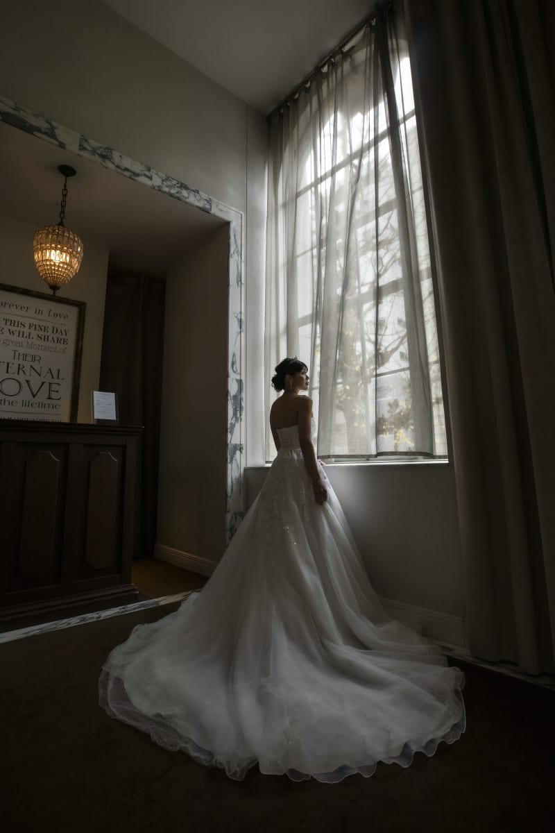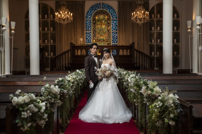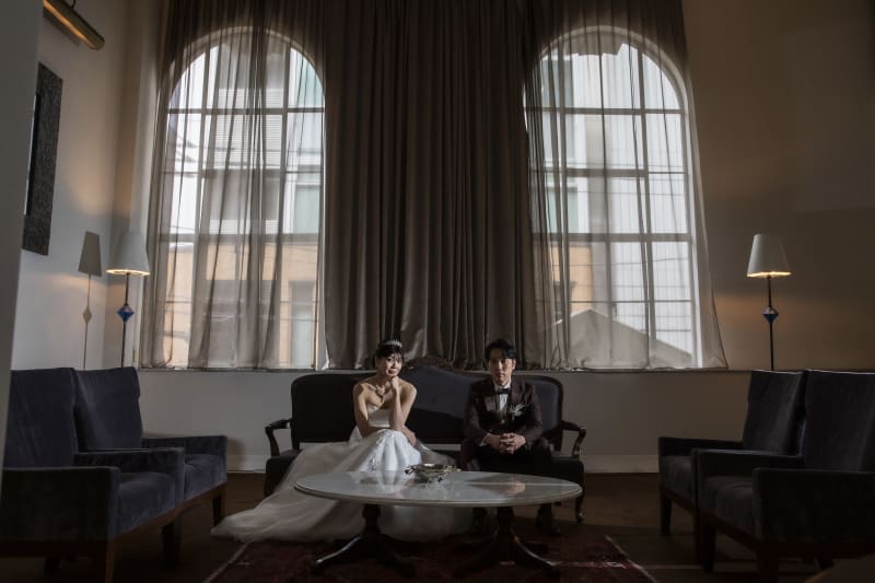 風格があるステンドグラスやシャンデリアを背景にフォーマルショット。