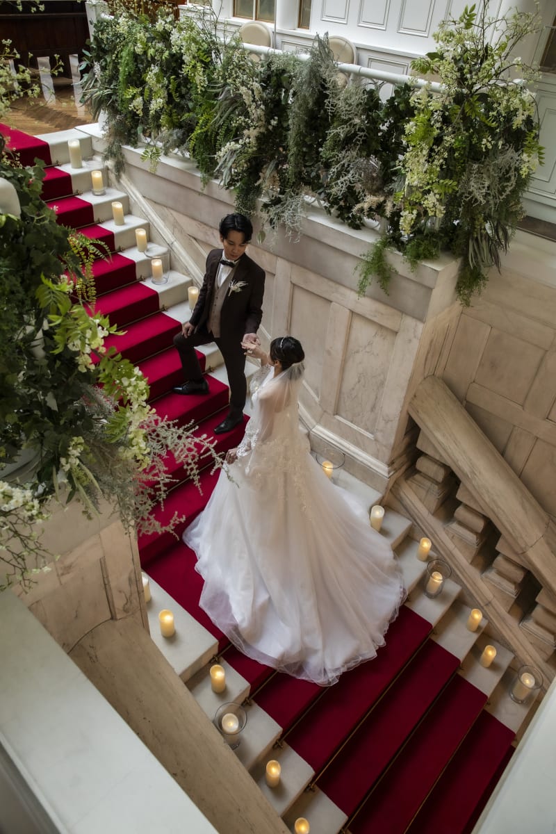 22段の大理石大階段にも深紅のバージンロードが引かれています。