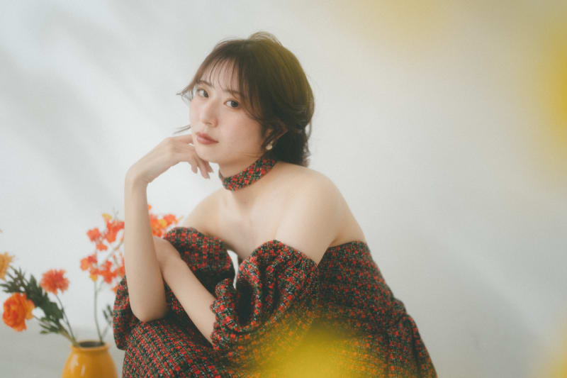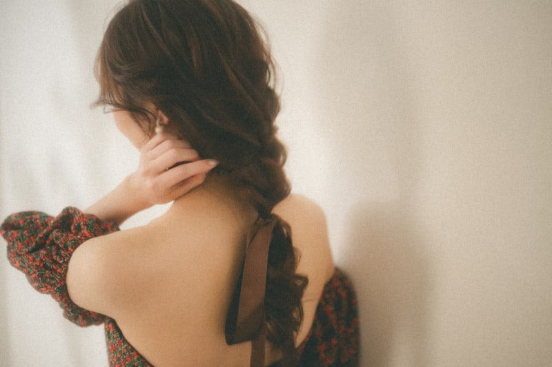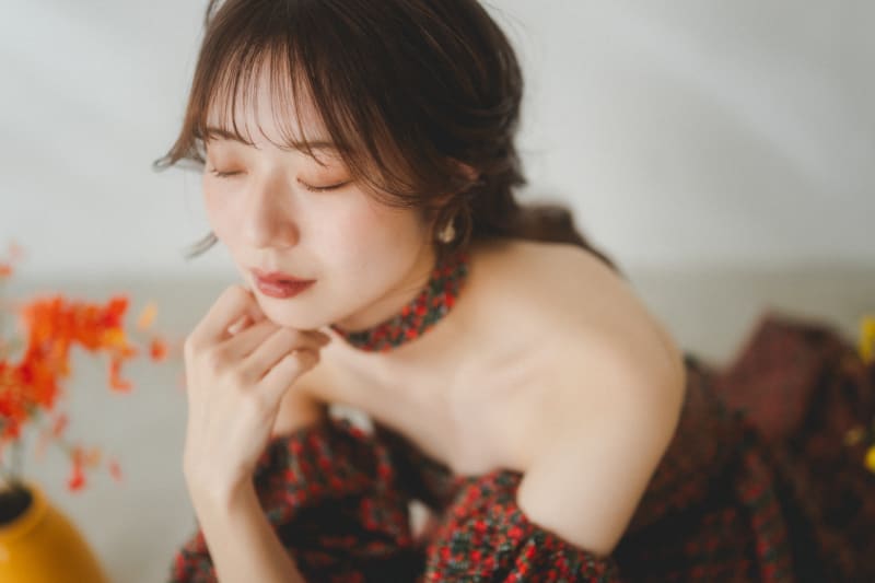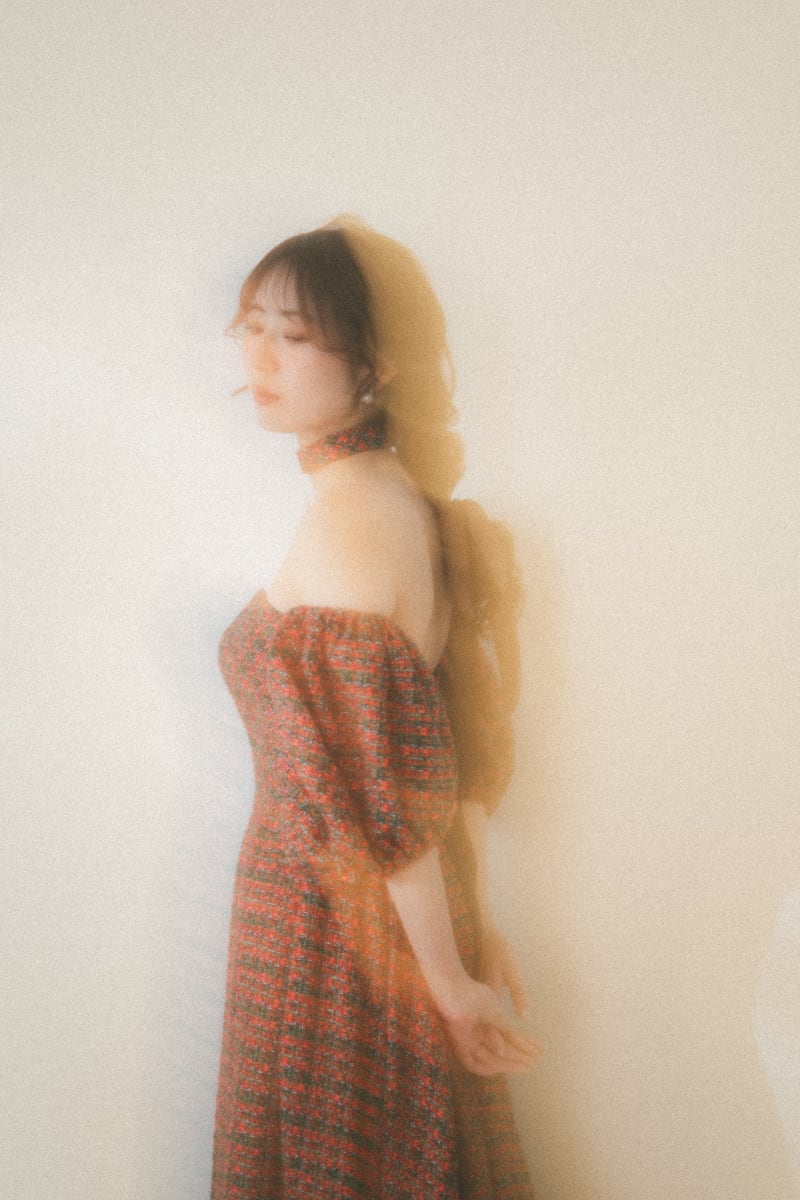ヘアスタイルはゆるっと編み下ろしにブラウンリボンをつけて落ち着いた雰囲気に。