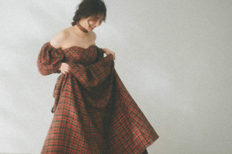 クラシカルなツイードを、現代的に仕立てたラグジュアリードレス。