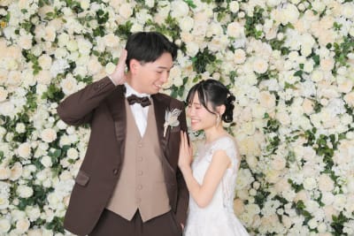 白いお花の背景の前でも可愛らしく撮影しました。新婦様にギュッとされて照れている新郎様とっても可愛いですね^^