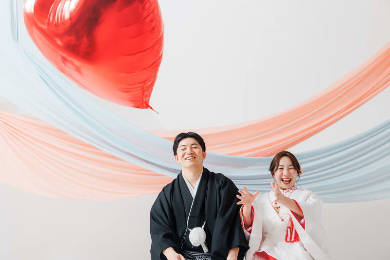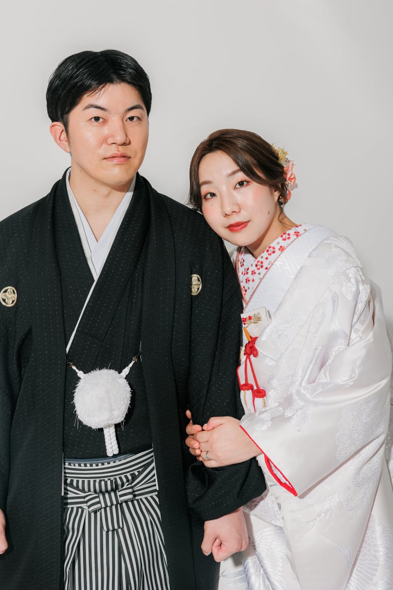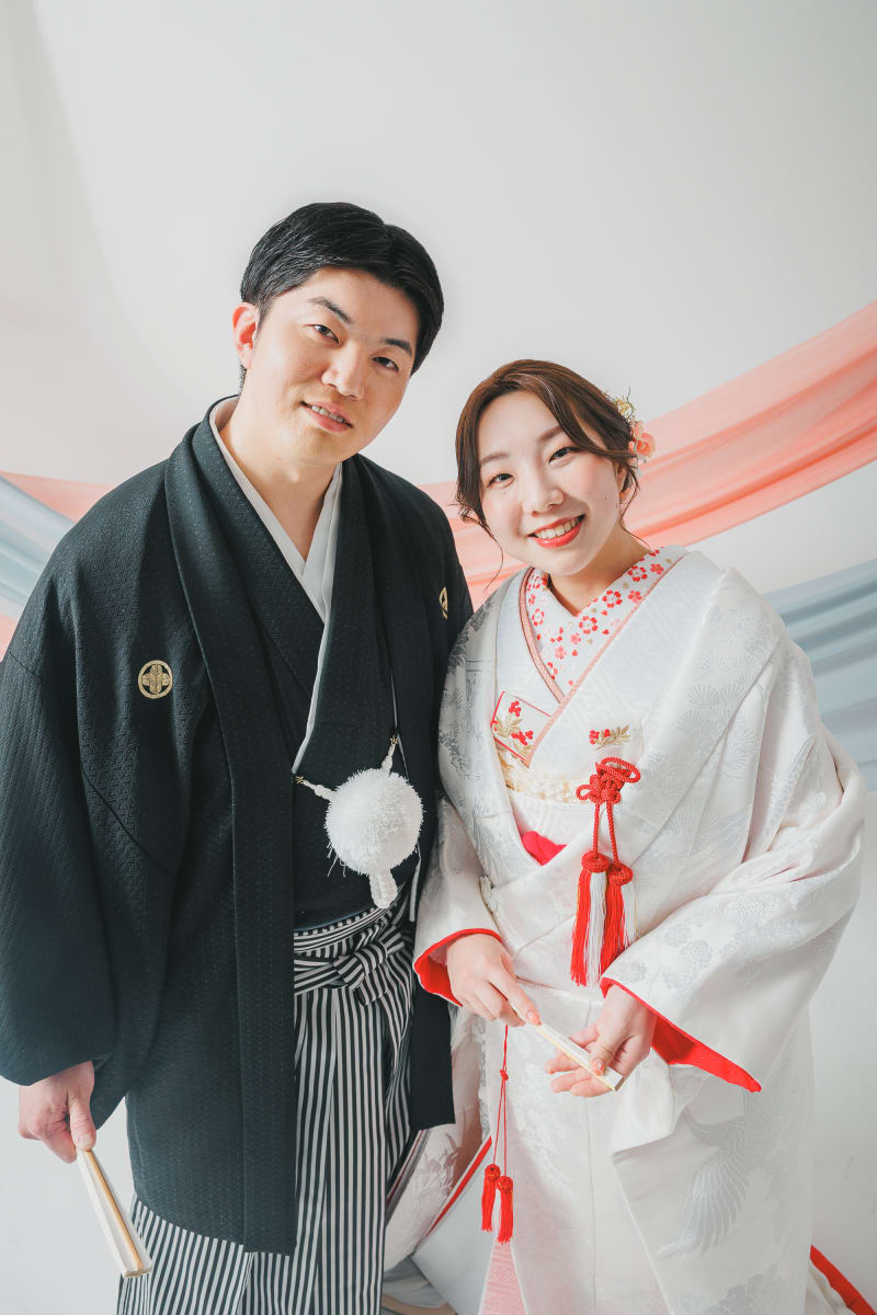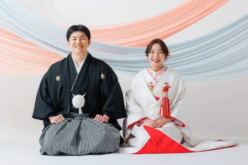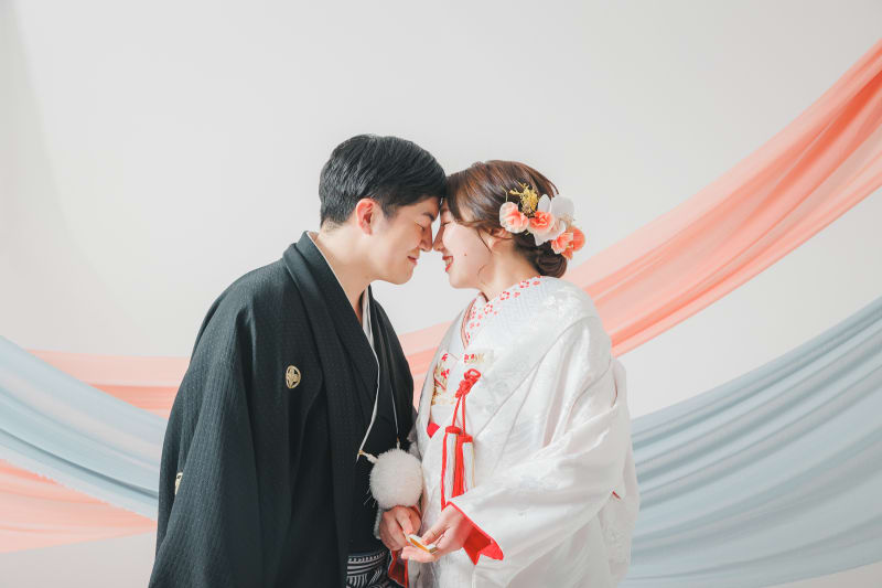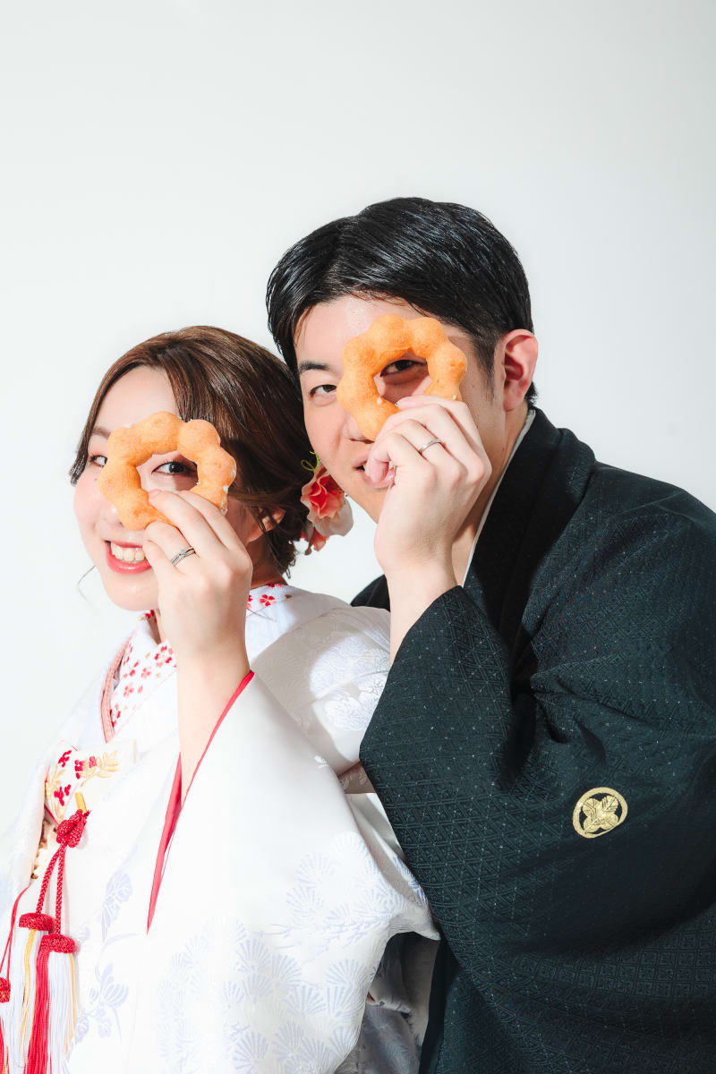 伝統的な白無垢と紋付袴に身を包みながらも、型にとらわれない「お二人らしさ」が溢れ出す撮影となりました。定番の正座ショットから、お気に入りのドーナツを使ったお茶目なポーズまで、シャッターを切るたびにスタジオ中に笑い声が響きます。見ているだけで幸せな気持ちになれる、遊び心たっぷりのブライダルフォトをぜひご覧ください!