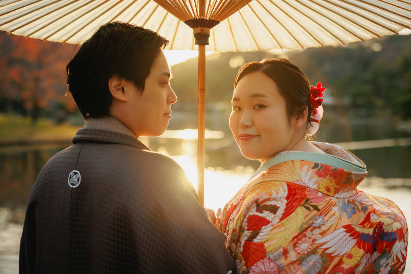 紅葉の綺麗な場所で撮影! お二人も和傘で映えますね!