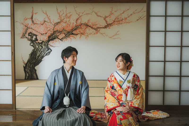 白木の空間に映える色打掛の赤は、お二人の凛とした決意を象徴するかのよう。