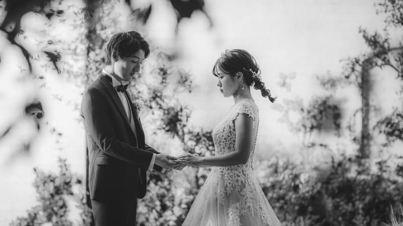 繊細なレースのドレスを纏い、指輪を交わす真剣な眼差しをモノクロで切り取ると、映画のワンシーンのようなドラマが生まれます。