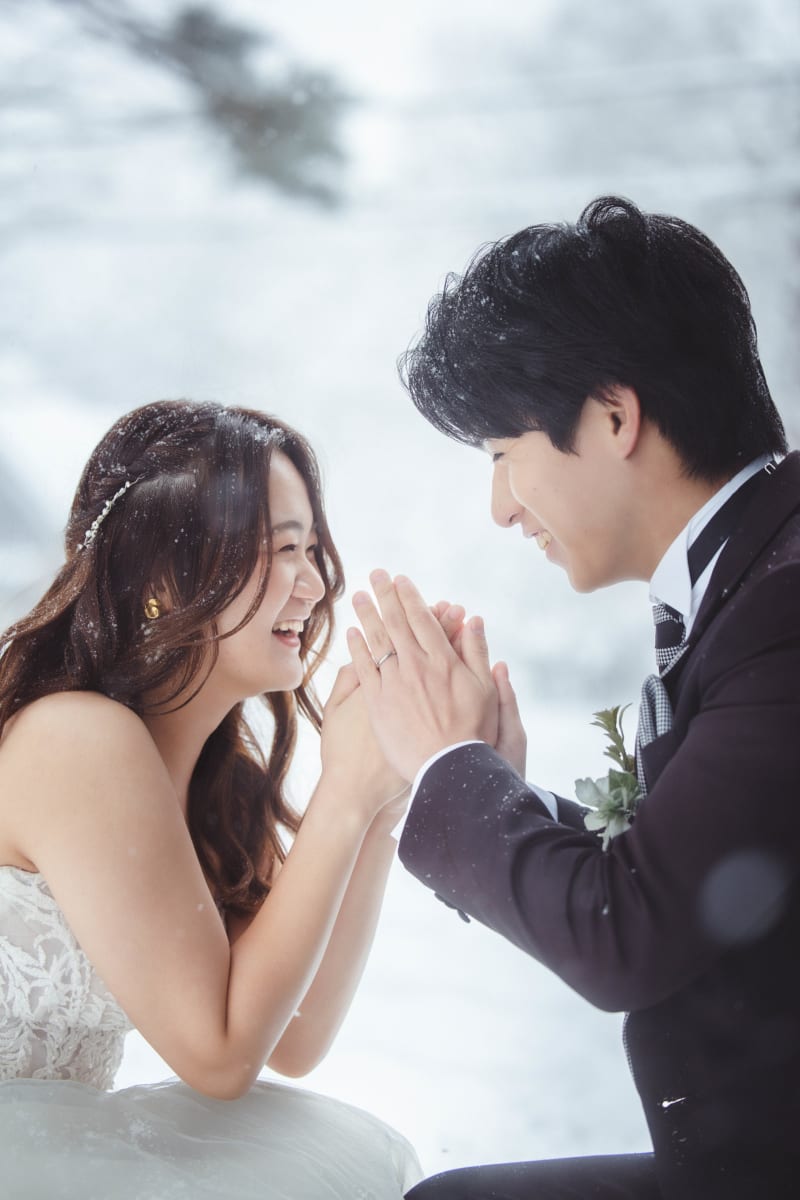 「冷たーい!」なんて笑いながら、お互いの手を温め合うお二人。吹雪の中でも、お二人の周りだけは春のような温かさ。