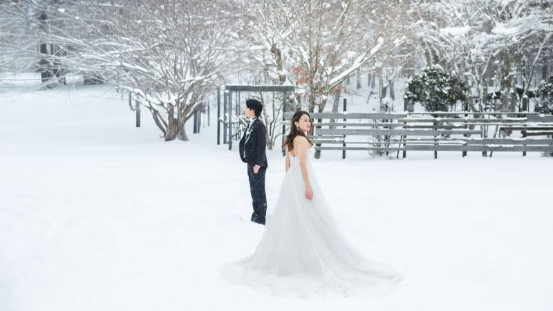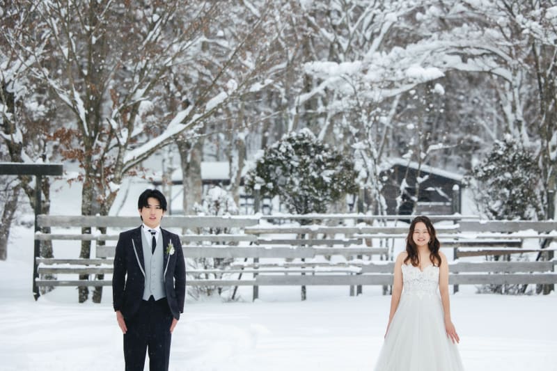 静かな雪原にお二人の姿が浮かび上がります。広大な自然の中に、お二人だけの時間が流れているようです。