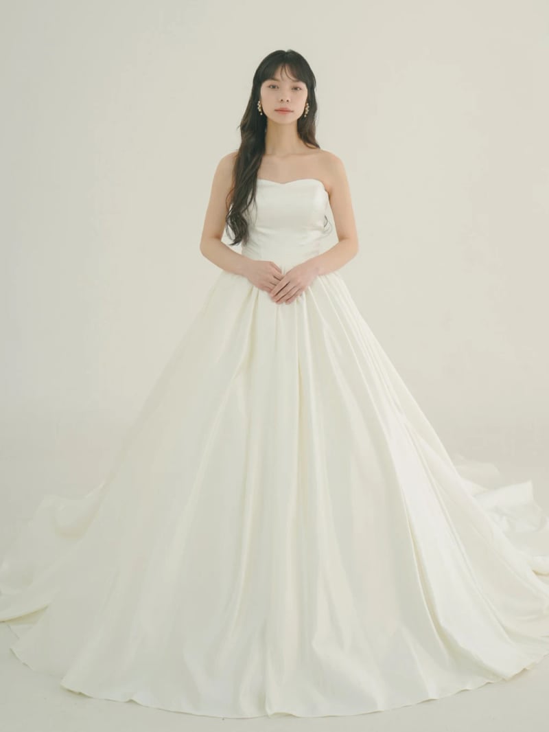 スカートはシンプルなフォルムながらサテン生地をたっぷり使用したボリュームのあるタックデザインで華やかさと可愛さを演出。程よい光沢感が花嫁様の上品さを際立たせます。