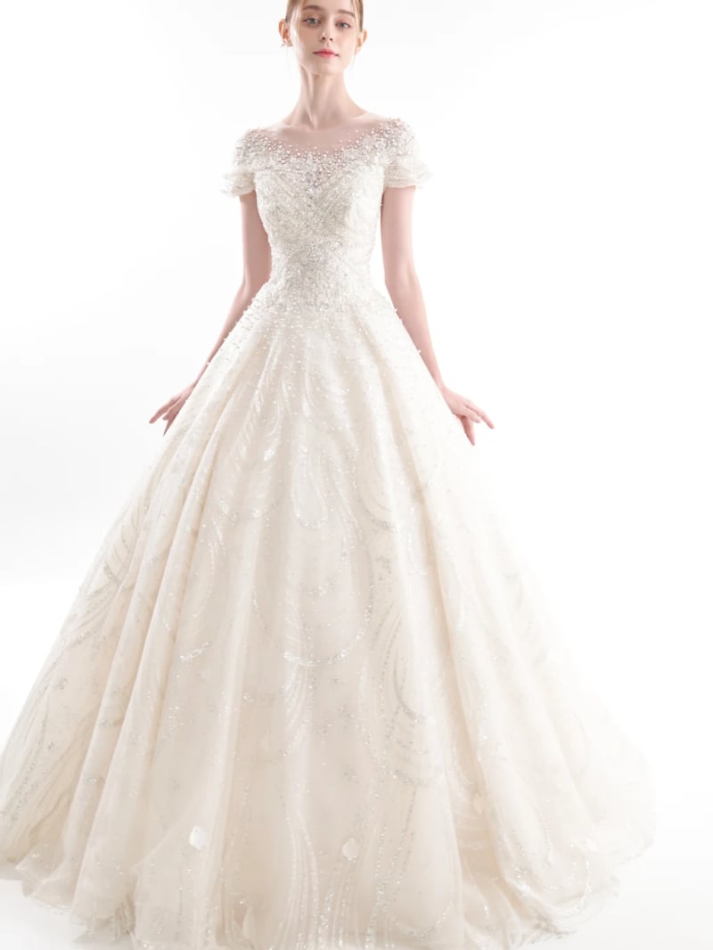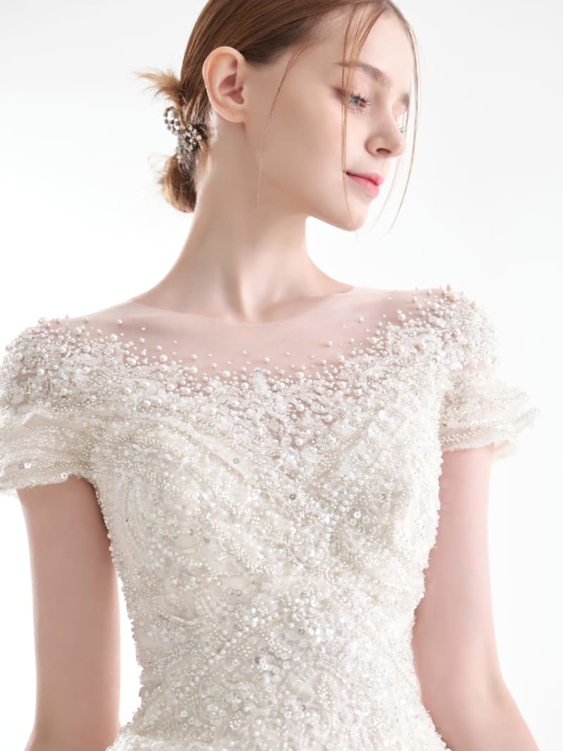 トップスのパールとクリアビース、スパンコールを使用したビーディング刺繍が圧巻の気品あふれるオフショルダードレス。