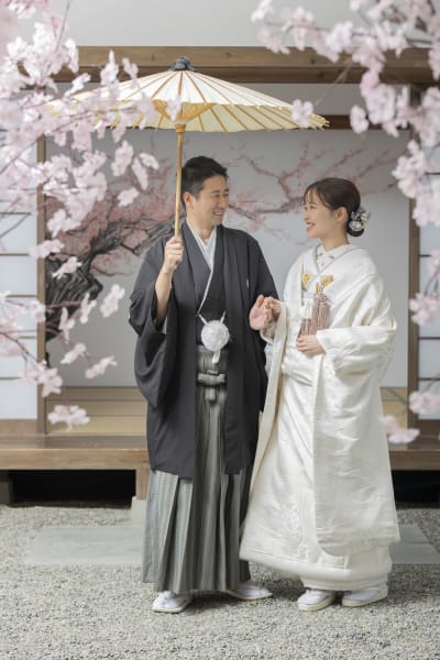 まずは白無垢と紋付袴を纏い、桜のアーチや本格的な和室のセットで。静謐な空気感の中にも、お二人の温かな眼差しが交差する瞬間がとても印象的でした。ポージングひとつで変わるドラマチックな雰囲気は、和装ならではの魅力です。
