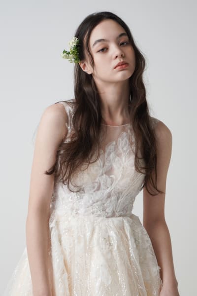 繊細にきらめくグリッターレースを全面にあしらった、幻想的な輝きを放つ一着です。
