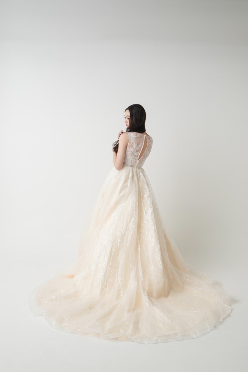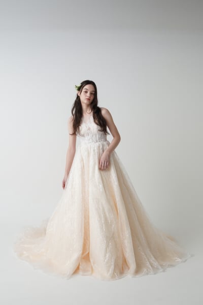 やわらかなニュアンスカラーのチュールに重なるグリッターが、動くたびに光を受け、花嫁様をやさしく